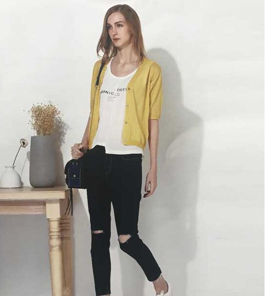 简单又有点破的牛仔裤肯定是时尚达人的必备休闲单品。简洁、大方的款式,只注重修身的剪裁,让你的小腿修饰得更加地匀称,七分裤的款式搭配白色的Tee,这样的懒人搭配,却意外地热让你感到亲切,有种校园感的穿搭,黄色的开衫外套披在外面,让你夏季可暖可凉爽。