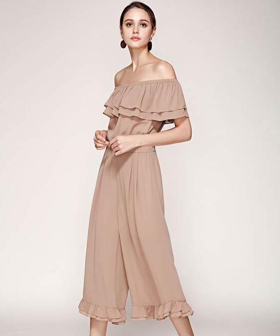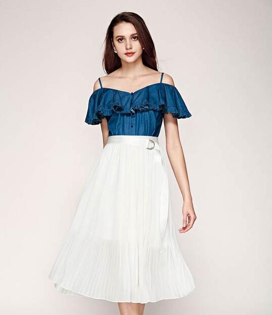 百褶裙简约的版型却处处都是小心机,金属质感的腰带让整体搭配更加的具有设计感,一字肩上衣的荷叶边设计,更加的活力清爽。