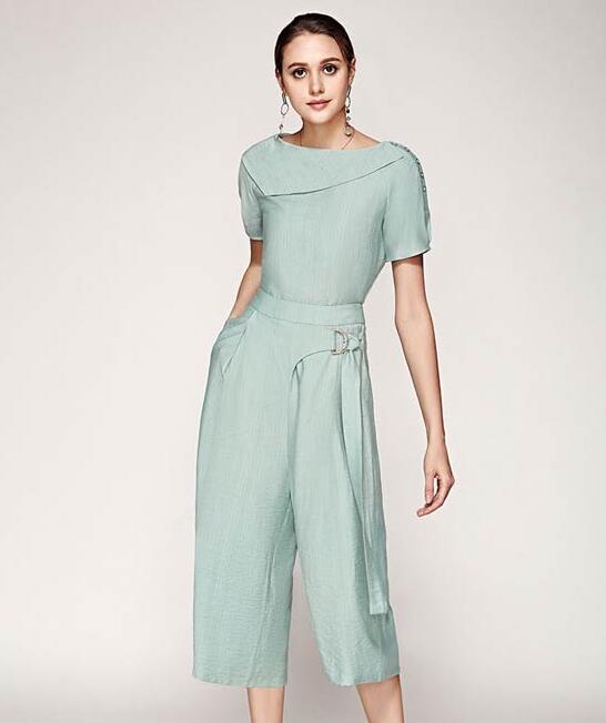 淡淡的抹茶绿,为你在炎炎夏日带来舒适与清凉,不对称前襟设计,独特而有张力,尽显女性优雅魅力。阔腿设计显得既休闲舒适又时髦自然,透出优雅迷人的随意感。