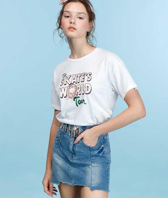 白色的tee上有着可爱的浅色的字母,上面画着地球的模样,牛仔裤的短裙是拥有很多不同的剪裁,然后缝接在一起,腰身的银色纽扣让这件衣服变得闪亮时髦了起来。小Tee和牛仔裤让女生纤细活泼的感觉展现了出来。牛仔裙和tee是非常简单好搭的穿搭,所以你也可以在日常备一两套。