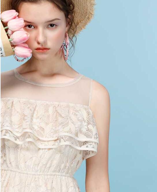 蕾丝的米色裙子非常有气质,这件蕾丝裙是具有花纹的模样的,穿在身上就像是花朵在身上绽放,攀岩,荷花边的重重叠叠两层在胸前垂下来,上身的薄纱背心让这件衣服更加地清爽,气质感在不同的层次中上升了。整件衣服配上草帽和玫瑰粉色的花朵,让这件衣服更加地好看了。