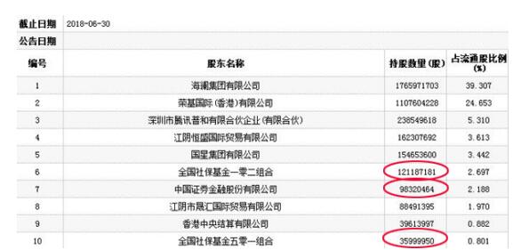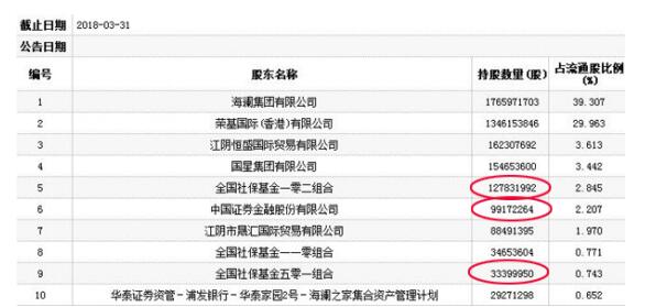 2018年一季度末,海澜之家前十大流通股东中,中国证券金融股份有限公司和三只社保基金在列。