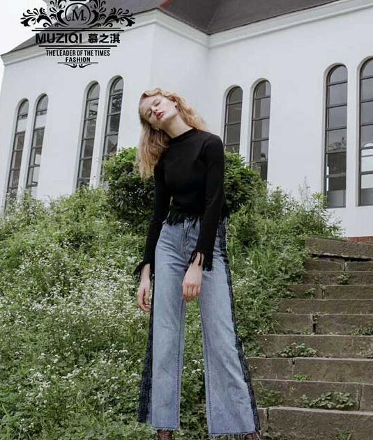 黑色的衣服的尾部挂满了细碎的流苏,牛仔裤是柔软的面料,侧边有蕾丝在腿部攀援,这样的颜色和浪漫的感觉就像是从上身一直延续下来的,咖啡色的皮鞋子整体是充满了个性和时髦,整体穿起来拥有着时髦和气质,特别适合纤细的女生。