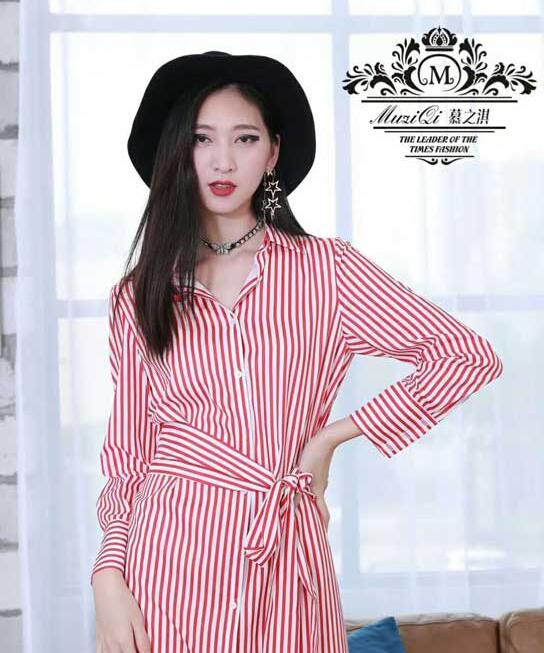 红色的竖条纹衬衫裙,拥有能够让皮肤显示好气色的红色,把整体感觉都提亮了。及膝的款式,在裙边把两边剪裁出两圆角侧边,本来文静的女人多了几分性感。腰部的蝴蝶结让这样更好看了。这样额衬衫裙能够单穿,能够跟裤子一起穿,这样的衣服是很好的单品。