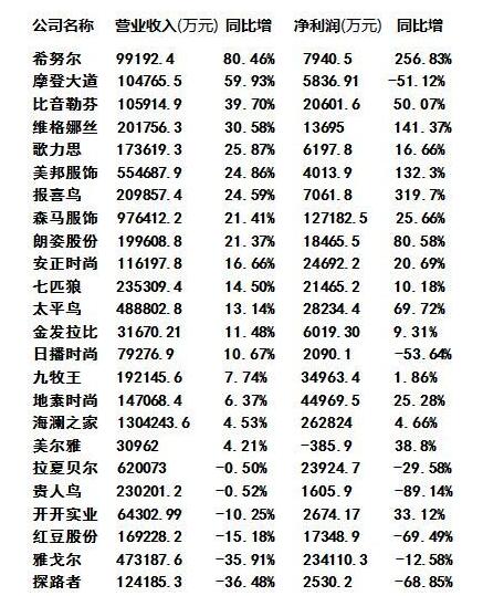 首先来几点温馨提示,一是本文所选对象为纯服装类公司,纺织企业及服装不是主业的未包括在内,二是只包括在A股上市的公司,未包括在香港上市的部分,三是所披露的数据只能作为参考不能太当真,原因太多就不详述,你懂的,四是好多未上市的服企可能会比某些上市服企赚得更多,活得更滋润,且不在少数,只是比较低调而已。先看一下成绩单: