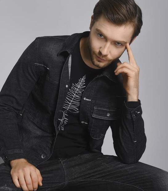 恩咖的这件牛仔外套设计简洁,内搭黑色印花T恤,青春减龄,却也带着一丝雅痞范儿。黑色T恤衫的别致图案,也为整体look的时尚度加分不少。