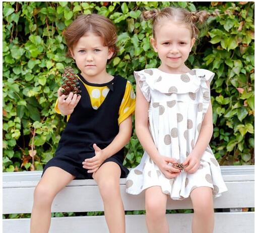 小女生杏黄色印花短袖,调配一条白色薄纱短裙,小男生宽肩印花背心,调配一条廓版的杏黄色五分裤,心爱的猫咪图案,显得十分心爱萌趣,精约新鲜的风格。