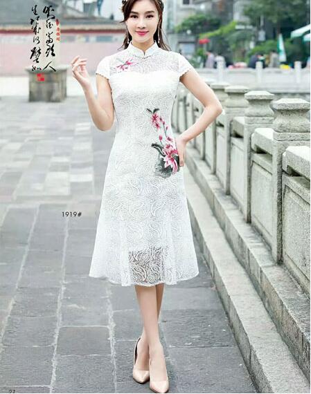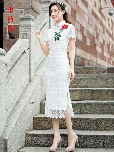 唐雅阁女装品牌2019春夏新款改进白色蕾丝连衣裙高雅时髦修身刺绣鱼尾旗袍连衣裙,立领的规划更可以显出女人脖颈的修长,修身的衣服凸显出女人曼妙的身材,精美的刺绣展现出高明的制造手法。