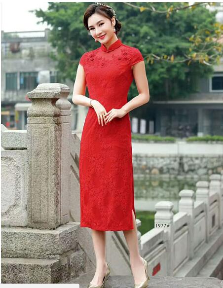 唐雅阁女装品牌2019春夏新款中长款蕾丝红色新娘香甜高雅改进日常旗袍式连衣裙,在中国传统中,红色向来都是喜庆的色彩。穿上这款裙子的你,就好像新娘一般成为全场瞩目的焦点。