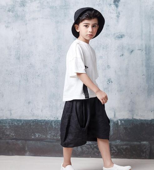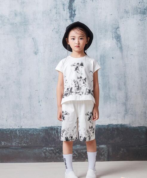 一身白色的短衣短衫上泼墨黑色山水画,这身精约的穿搭不只是衣服童装,就像一幅见识丰盛的山水画作。