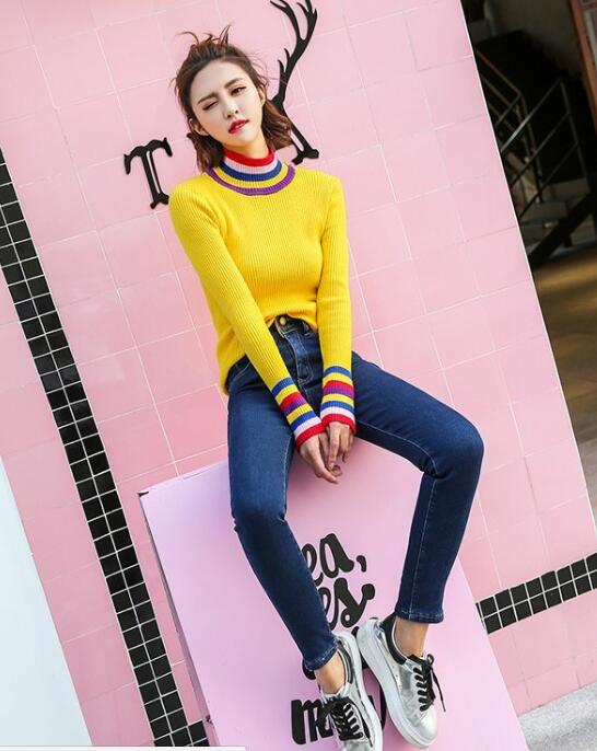 黄色针织衫款式搭配,针织造型高领的设计,彩色条纹的修饰,春秋季节单穿非常不错,作为冬季的内搭也很亮眼,这只是一个季节的单品,每个季节都能创造不一样的感觉,可以来尝试看看。