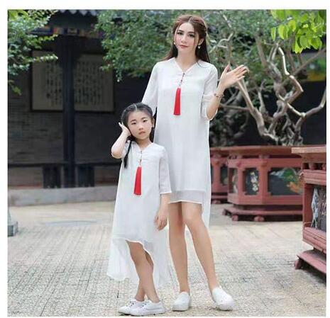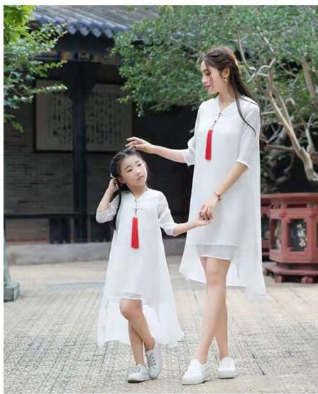 盘扣下方的红色流苏给整体单一的白色增添了一抹色彩与亮点,带来满满的文艺范。优质的亲肤面料在炎热夏季穿起来也依旧清凉舒适。一大一小可爱的亲子装搭配起来有爱又可爱,又带着别致的传统风情。
