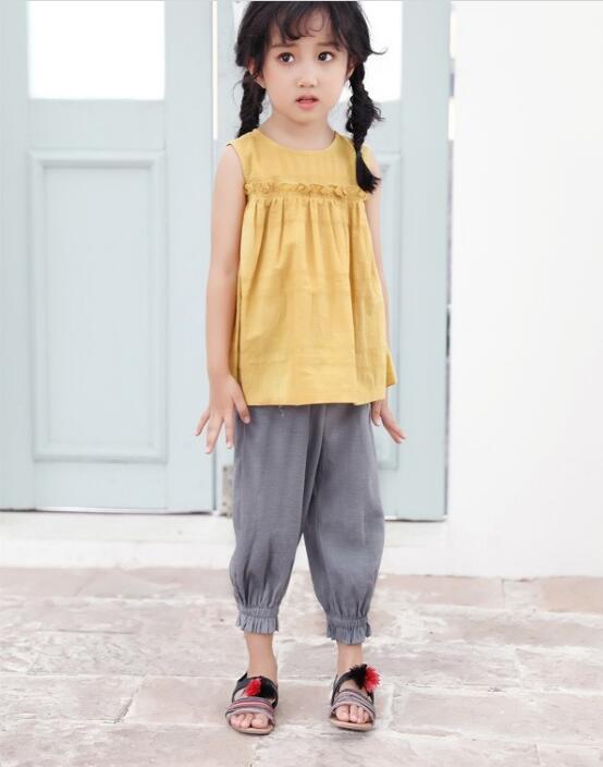 这套搭配就是比较偏休闲的系列,一眼看上去就非常的舒适,一件淡黄色的背心式上衣就相当的可爱活泼了,胸口处还有小花边的设计,非常的精致。下身是一条灰色的灯笼裤,宽松的裤子穿起来会非常的舒适,尤其是对于活泼爱动的小孩子来说,比较舒适宽松的衣服更博得他们的喜欢。这套颜色的搭配也很和谐,很自然。