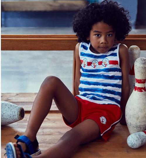 在今年夏天最后一针高温的考验下,小朋友们的清凉风格派上了用场一件简约的背心式蓝白条纹小衫,搭配一条红色运动短裤,休闲运动范也很酷耶。