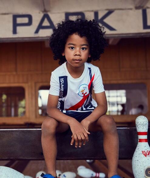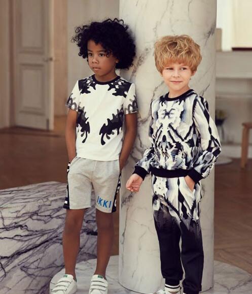 经典的黑白配是传统的色彩,不管怎样进行款式搭配,总能出现意想不到的效果,这两款童装,不管是T恤搭配短裤还是长款套装,白色的底调中浓墨重彩的黑色,对比中炫美感。