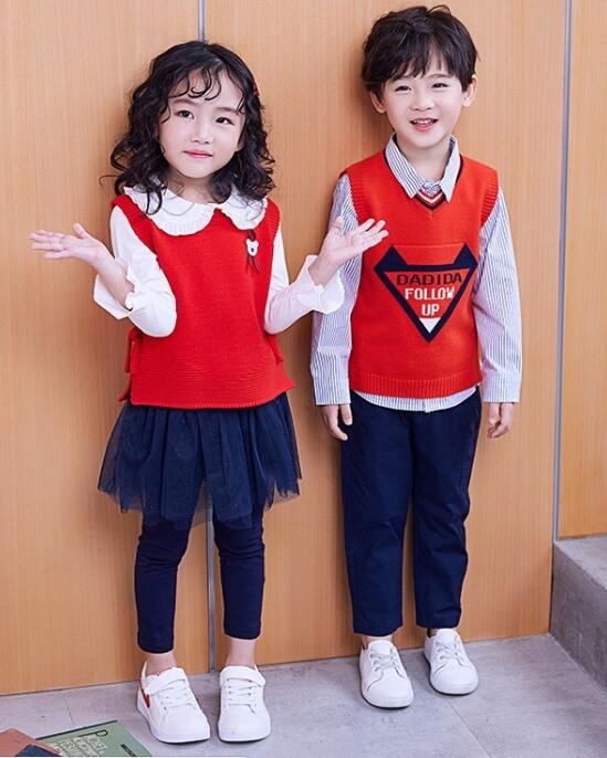 先来一款红色毛衣背心款式,毛衣的单品呈现,红色充满火热感的颜色,红色背心款式配上一件白色衬衫即可,男童则是蓝白色条纹衬衫装扮,下身深蓝色裙装、裤装都可以,打造兄妹装。