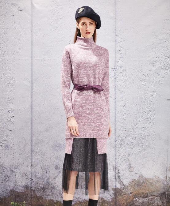 这件针织的长款毛衣看起来非常的显气质,浅紫色的配色,看起来时尚又很好看,而且还是高领的设计,温暖又很时尚,下面搭配一件黑色的纱裙,毛衣和纱裙的搭配是很多女生都很喜欢的时尚搭配之一,这样的搭配更显高级。