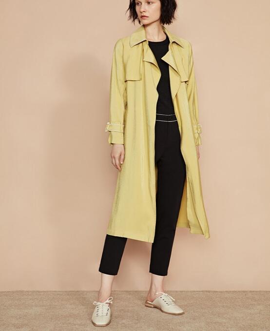 非常具有衬肤感的这件黄色的风衣外套,颜色特别的时尚耐看,而且在萧瑟的秋冬里,增添了不少活力元素。加上过膝的设计,让衣摆能够随风起舞,提升了气场又悄悄诉说对秋天的种种爱慕。搭配上极简风的黑色圆领针织衫,黑色的小脚裤,一双米白色的法式小皮鞋,让整个造型更有整体感。