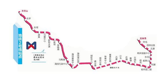 厦门地铁2号线起点坐落天竺山森林公园,结尾坐落本岛五缘湾,全场41.6公里,全线为地下线,选用标准B型空调车辆,六辆编组,最高时速为80km/h。