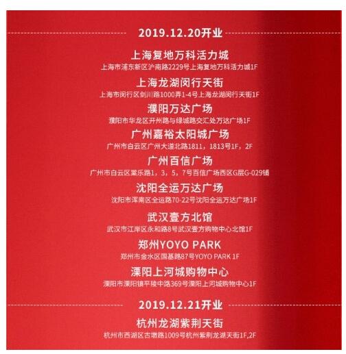 莆田运动鞋网消息,12月20日至21日,优衣库十店同开,包括上海复地万科活力城、上海龙湖闵行天街、濮阳万达广场、广州嘉裕太阳城广场、广州百信广场、沈阳全运万达广场、武汉壹方北馆、郑州YOYO PARK、濮阳上河城购物中心及杭州龙湖紫荆天街。在2019年末,优衣库中国内地门店数量再添新高。