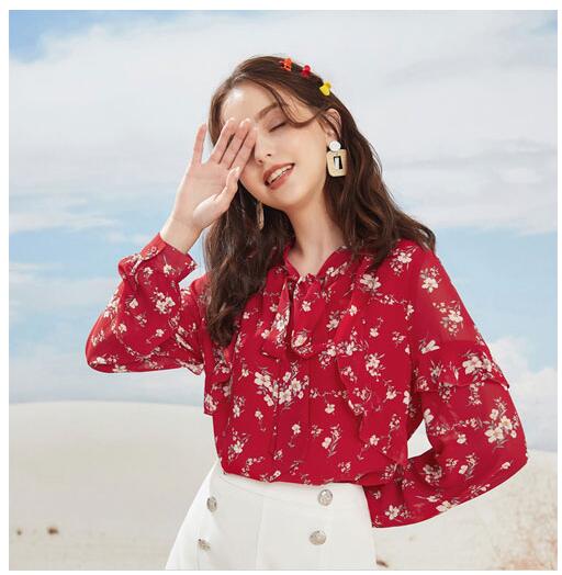 再来看看这一款穿搭,上半身一件红色的衬衫,用满满的碎花元素来点缀,远远望去好似一团炙热的火焰在跳动,下半身则可以搭配白色的半身裙来衬托红色的艳丽。整体造型非常和谐,充满了生机和活力。