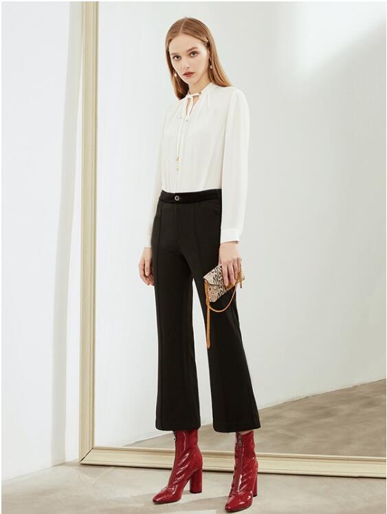 这款黑白两种颜色的搭配是不是很好看,白色上衣简约干净,衣领的设计很是好看,蝴蝶结系带的设计将女性优雅与浪漫展现出来,版型是很修身的,采用雪纺衫的面料制作成为,穿在身上,,下身搭配一件黑色西装裤,高腰的设计在视觉上拉高身材比例轻松 穿出大长腿,而且黑色颜色很是显瘦,搭配一双高跟鞋, 整体的造型简约优雅