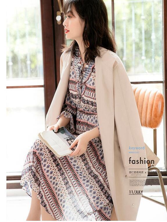 这款连衣裙的搭配是不是很显女人味这款连衣裙的设计充满了波西米亚的风情,V领的设计露出性感的锁骨曲线,版型是很修身的,采用优质的面料制作而成,穿在身上舒适简约,裙摆的长度露出性感的腿部曲线,搭配一件卡其色的大衣,是不是很时髦也很显气质,搭配一双高跟鞋, 整体的造型简约大方。