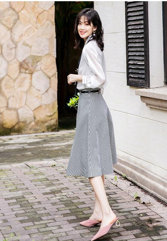这款半身裙的搭配也很好看的呢,上衣采用衬衫的版型制作而成,穿在身上很显气质的,翻领的设计经典大方,版型是很修身的一款白色的颜色百搭又好看,下身搭配一件格纹半身裙, 裙摆的长度露出性感的腿部曲线轻松穿出自己的性感与时髦,搭配一双高跟鞋,或者是平底鞋,都可以,穿出自己的优雅气质。