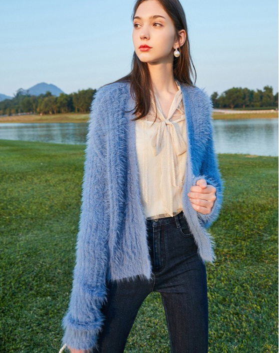 这款蓝色毛衣穿在身上不仅显白还很时髦,开衫的设计在春季的时候穿不冷不热,刚刚合适,内搭一件卡其色的上衣,衣领的设计将女性的优雅与浪漫完美的展现穿胡来,蝴蝶结的设计很是俏皮,版型是很合身的, 下身搭配一件黑色牛仔裤,高腰的设计轻松穿出自己的大长腿,将自己的时髦气质完美的展现出来。