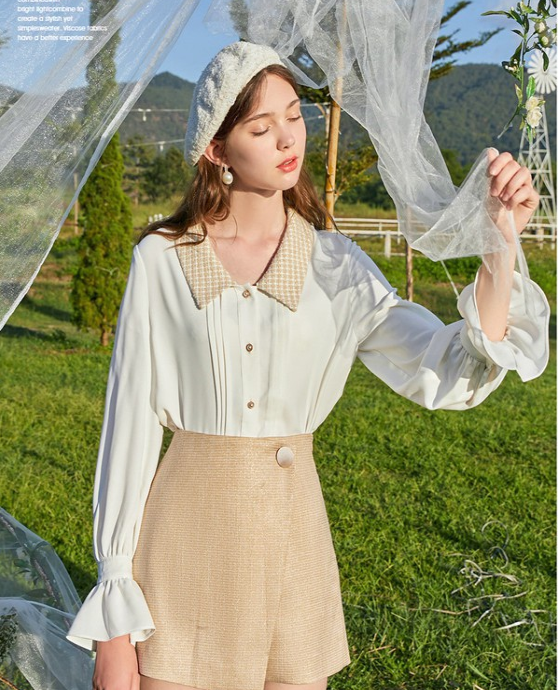 这款套装的搭配非常的减龄也很显气质,穿在身上妥妥的一枚淑女,衣领的设计不仅将性感的锁骨显露出来,还很时尚,纽扣的搭配点睛之笔,让这款衬衣充满了休闲的味道,袖子出花边的设计将女性的浪漫与唯美展现出来,下身搭配一件纯色半身裙,裙身的设计很是性感,将性感与甜美集与一身,很是时尚漂亮。