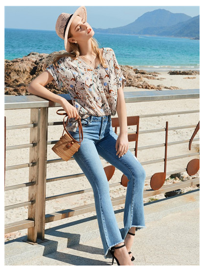 这款雪纺短袖的设计也很时髦,而且衣服上碎花图案的设计很是好看,将女性的优雅与浪漫展现出来,V领的设计将自己性感的锁骨显露出来,版型都是很宽松的穿在身上舒适简约,下身搭配一件牛仔裤,高腰的设计将自己的小蛮腰穿出来,喇叭裤脚的设计很是时髦哦,搭配一双高跟鞋,整体的造型休闲简约。