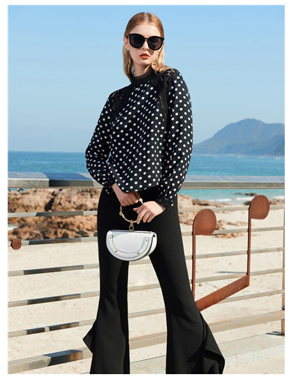 这款黑色波点衬衣采用雪纺的面料制作而成穿在身上舒适简约,衣领的设计修饰脖颈曲线的同时将自己的脸型修饰的很好看,波点元素复古时髦,而且还能将自己的好身材穿出来哦,下身搭配一件黑色裤子,喇叭裤的设计很是好看,黑色的颜色不仅不挑人还很百搭哦,搭配一双高跟鞋,整体的造型简约大方。