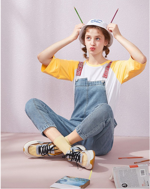 这款牛仔背带裤真的是休闲简约的代表哦,上身搭配一黄色拼接短袖,九分袖的设计很是好看,圆领的设计修饰脖颈曲线的同时将自己的脸型修饰的也很好看,牛仔裤的设计也是很合身的而且穿在身上将女生的俏皮感展现出来,搭配一双运动鞋,整体的造型简约大方,将休闲范体现的淋漓尽致。