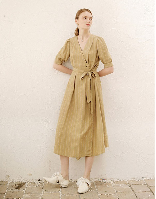 这款黄色条纹连衣裙穿在身上很显气质,V领的设计轻松将自己性感的锁骨曲线完美的展现出来,黄色的颜色很是清新自然哦,很符合春天的时候穿,纽扣的设计看起来简约大方,腰间搭配一条蝴蝶结腰带轻松将自己的小蛮腰展现出来,裙摆的长度露出性感的腿部曲线,搭配一双平底鞋,整体的造型简约大方。