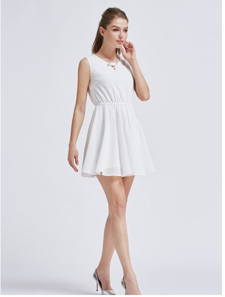 这款白色连衣裙穿在身上也是很好看的,圆领的设计简约,无袖的剪裁在夏天的时候很是清凉,腰间收腰的设计将自己的好身材完美的展现出来,白色的颜色干净温柔,裙摆的长度露出性感的腿部,将自己的性感显露出来,搭配一双高跟鞋,整体的造型简约优雅轻松穿出自己得优雅气质,这样的连衣裙是不是很好看。