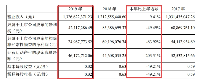 日前,童装品牌安奈儿发布了2019年年度报告。报告显示2019年全年实现营收13.27亿元,较2018年增长9.41%;归属上市公司股东的净利为0.42亿元,与2018年相比大幅下滑49.49%;归属上市公司股东的扣非净利润为0.25亿元,下滑63.92%。