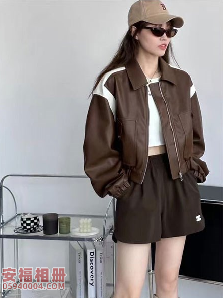 棕色皮革翻领夹克衫,白色点缀,展示出率性与活力的结合。