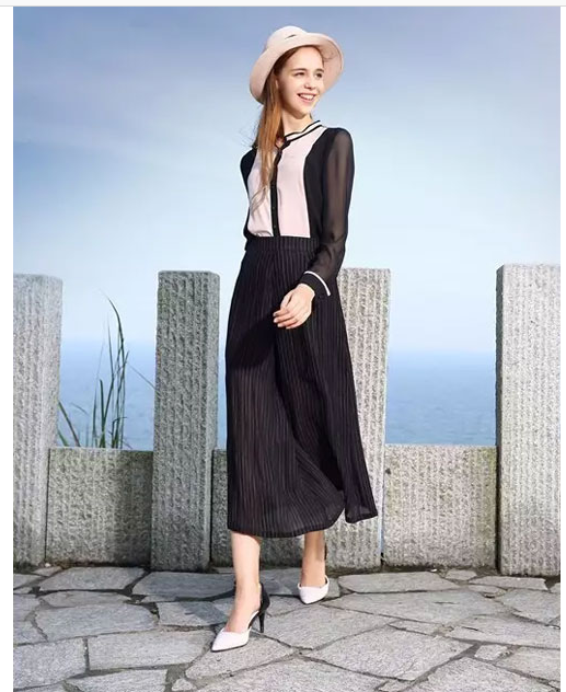 条纹阔腿裤的优势是下身份额一拉长,整个人看起来就细长了许多!尖头高跟鞋与小白鞋肯定也是穿搭的好同伴,除了协助身型细长,也更时尚。