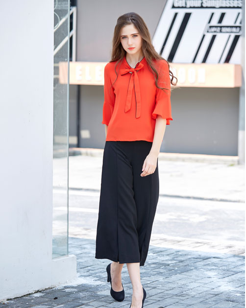火热的橙色衬衫穿在身上几乎美艳的不得了,无论是在街上或者在公司都是一道靓丽的风景线,领口有个蝴蝶结调配起来更加的美观,面料也十分的舒适亲肤,规划师还给这款宝贝做了喇叭袖的款式规划,不只幽默灵动!并且整体规划尽显女人味十足!