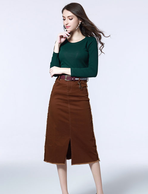 如果问什么颜色最有贵族气息,恐怕墨绿色会居其一。墨绿色的色调较暗,又因为略带些深灰,所以很容易就能搭出“高级质感”。墨绿色长袖T恤搭配棕色半身裙,美得让人无法自拔。这样的组合才是真正有格调的色彩,给人一种全新的感觉。
