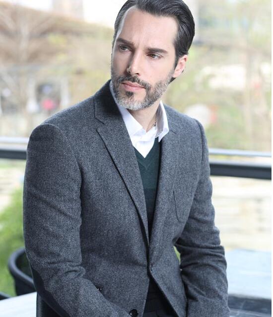 这一款黑灰色的西装外套,像入夜前消逝的黄昏,平静深沉。中规中矩的翻领,细致而洋气,柔和的布料如男人细腻的内心,安静地显露,低调的颜色一如既往的稳重,沉稳而不张扬。内搭一件藏青色的毛衣和白色衬衫,青春带感,一副成功人士商业范。时尚、绅士。