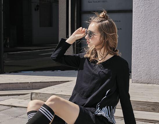 全黑的装扮,深邃而有气质。简约而不简单的版型,具有极简主义低调不做作的美感。侧身的白色条纹点缀了浑然的黑,画龙点睛的效果。