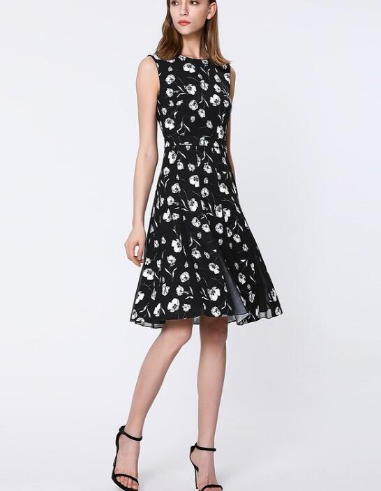 简约轻熟风的造型可以优选简约不失气质的单品,裙子作为女性的专属单品,可以提升造型的气质感。夏日就可以选择一款无袖连衣裙,莆田安福家园的这款黑色印花无袖连衣裙,颜色经典耐看,印花设计让造型更具看点,避免单调,利落大方的版型,提升造型的气质。再挑选一款黑色气质高跟凉鞋,打造出了气质感的轻熟风造型!