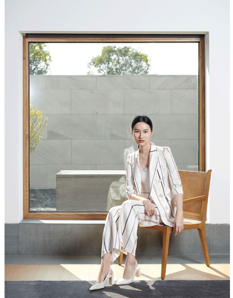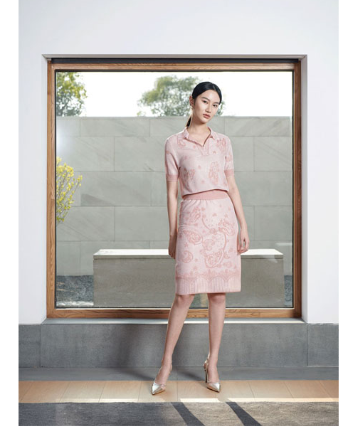 最后来看看这一款穿搭:POLO针织上衣+针织半裙。用自带温婉气质的樱花粉来代表春天再适合不过。天然的精致面料具有舒适的体感,精巧的提花工艺使得服装上的图案变得生动起来。整体的造型温婉端庄,完美展示了东方女性的美。