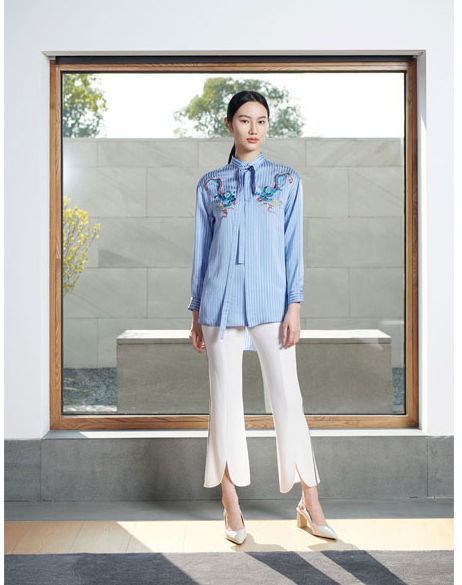 再来看看这一款搭配:刺绣龙纹衬衫+三醋酸直筒裤。天蓝色的色调使得衬衫看起来非常雅致、高级。带有吉祥寓意的精致龙纹非常好看而且也表达了美好意蕴,中式小立领设计更是将整体的气质提升了一个档次。